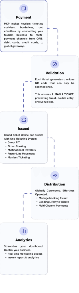 MKP helps leading attractions, theme parks, and cultural sites in Indonesia upgrade their ticketing systems with instant issuance and secure validation. Designed for international visitors and peak seasons, our platform ensures every journey is faster, smarter, and multi channel payment ready so destinations can grow without limits.